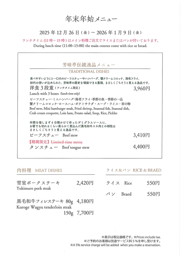 年末年始の2025年12月26日(金)〜2026年1月9日(金)の期間は以下のメニューに限定し販売いたします。